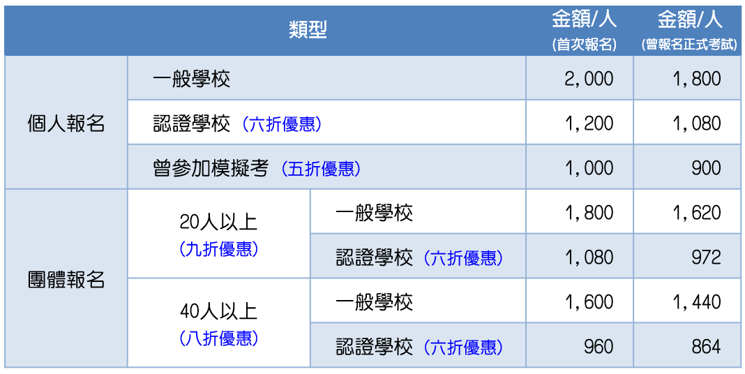 認證學校之在學生與畢業生、曾參加模擬考及過去曾報名本證照正式考試的同學皆有優惠;20人以上與40人以上團報之同學亦另有優惠,詳情請參閱下表。